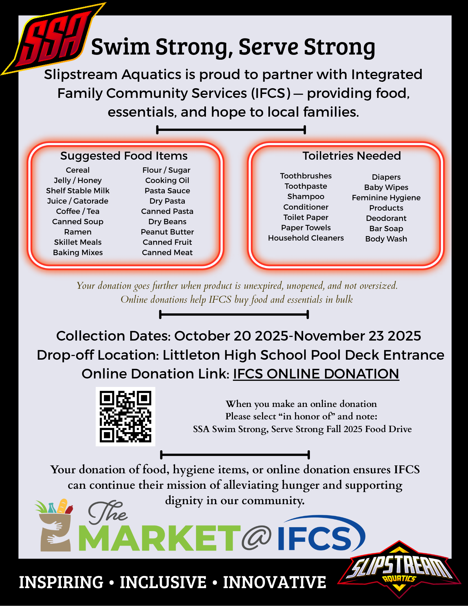 As we dive into November, don’t forget our Swim Strong, Serve Strong Food Drive supporting IFCS! This is a chance for our swimmers and families to give back to the community, helping local families in need with food and hygiene items.